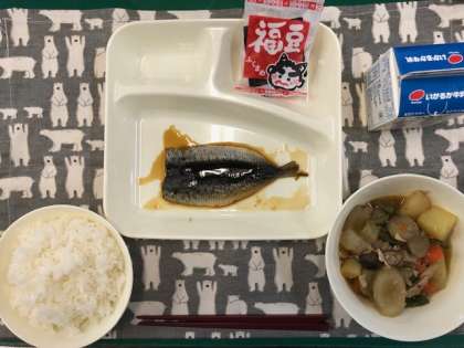 節分の日には、病気や悪い出来事を追い払うため、「鬼は外、福は内」と言って豆まき「したり、年の数だけいり大豆を食べたりする風習があります。給食では、節分の行事献立として「いわしの生姜醤油かけ」と「いり大豆」が出ます。
