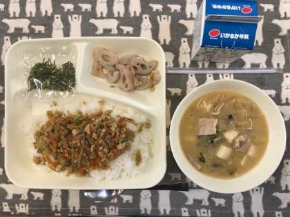 今日の献立は、・とりごぼうご飯 ・みそしる ・焼きれんこん ・牛乳 です。