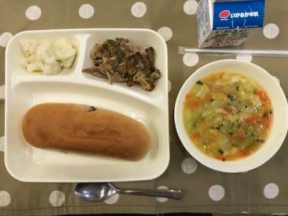 今日の献立は・レーズンパン ・豚肉のカレー風味焼き ・コーンと白菜のスープ ・カリフラワーのレモンドレッシング ・牛乳 です。
