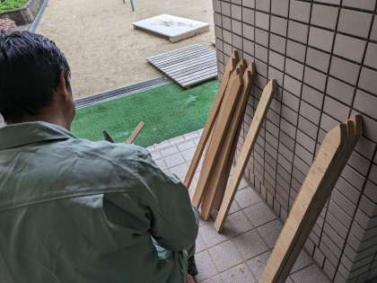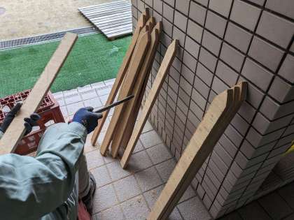 2月20日 野菜部で 公開日 2024/02/20 更新日 2024/02/20 お知らせ 管理作業員さんが、野菜部で使う看板用の杭を作ってくれています。やすりで磨いたあと、ペンキ、ニスを塗り、水で腐らないようにするそうです。 いいね(0)