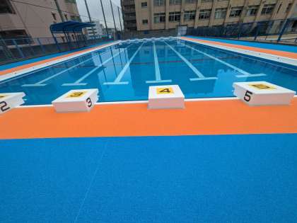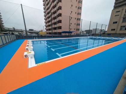 改修工事が終わりました。万が一に備え消防用水として使えるように水を入れました。水面に周りの景色がうつって、とてもきれいです。夏の水泳学習が楽しみですね。