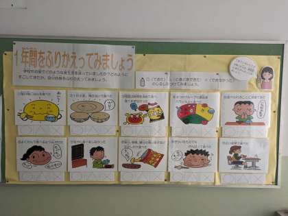 玄関の掲示物と給食の振り返りの掲示物です。