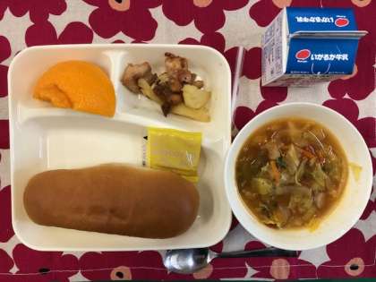 今日の献立は、・黒糖パン ・鶏肉とじゃがいものガーリック焼き ・ウインナーとてぼまめのスープ ・デコポン ・牛乳 です。