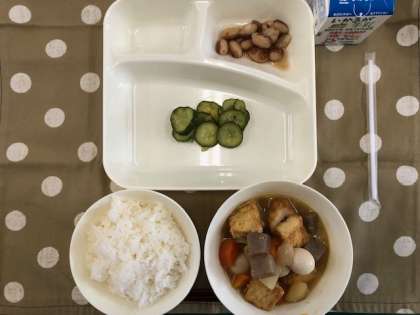 3月4日(月) 本日の献立 公開日 2024/03/04 更新日 2024/03/04 お知らせ 今日の献立は、・ご飯 ・関東煮 ・きゅうりの梅風味 ・とら豆の煮物 ・牛乳 です。 とら豆は豆の模様が濃い黄褐色と薄茶色で、動物のとらに似ている模様がある豆です。炭水化物やたんぱく質、カルシウムのほかに、お腹の調子を整える食物繊維も含まれています。 いいね(0)