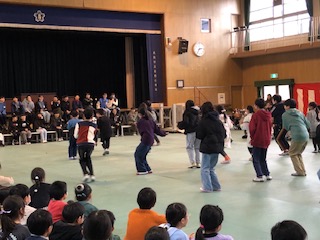 まずは5年生がお手本を見せ、続いて6年生も一緒に踊ります。最初は照れ臭さそうにしていましたが、いざ、曲が流れ始めると、全力で踊り始めました。