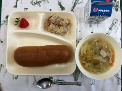 3月8日 本日の献立 公開日 2024/03/08 更新日 2024/03/08 お知らせ 今日の献立は、・黒糖パン ・豆腐のミートグラタン ・じゃがいもと野菜のスープ ・いちご ・牛乳 です。 いちごは、江戸時代にオランダから観賞用として伝えられました。いちごは、果物の中でも特にビタミンCを多く含んでいます。ビタミンCは、病気に負けない力をつけてくれます。 いいね(0)