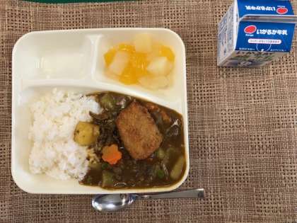 今日の献立は、・カツカレーライス ・フルーツゼリー ・牛乳 です。
