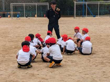 体育の学習です。先生の話をしっかり聞いています。