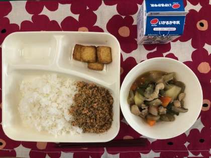 今日の献立は、・ごはん ・鶏肉とじゃがいもの煮物 ・厚揚げのしょうゆだれかけ ・紅鮭そぼろ ・牛乳 です。