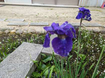 管理作業員さんが整備してくださったビオトープに紫色のきれいな花が咲きました。雨にも映える立ち姿。さてこの花の名前は何でしょう?