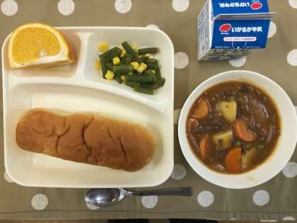 今日の献立は、・おさつパン ・ビーフシチュー ・さんどまめとコーンのサラダ ・あまなつかん ・牛乳 です。