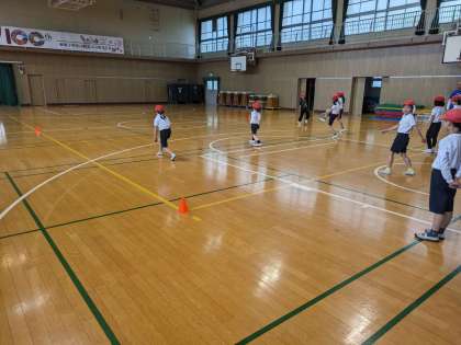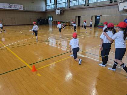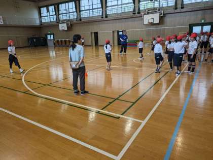体育の学習です。運動場が使えなかったので、体育館での学習です。
