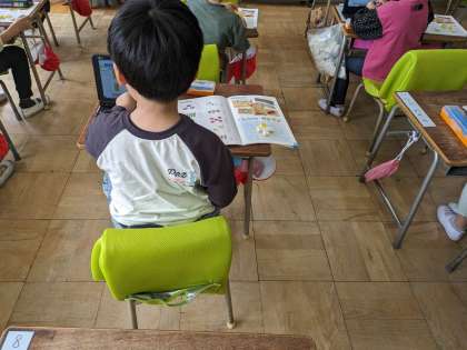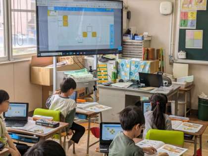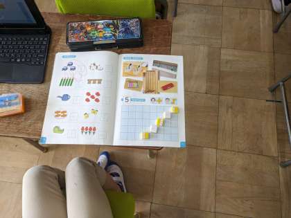 算数の学習です。パソコンとブロックを使って、5ならべをしました。