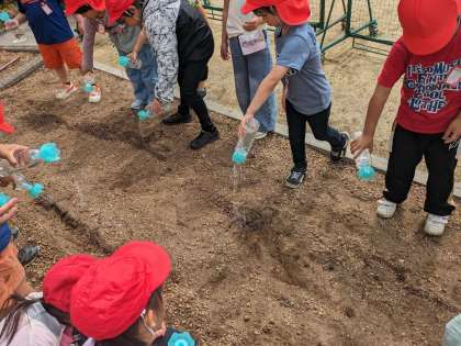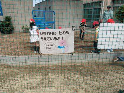 ひまわりの種をまきました。お世話を頑張って、夏に大きな花を咲かせましょうね。