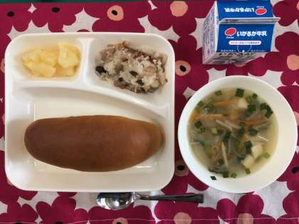 今日の献立は、・黒糖パン ・金時豆の中華おこわ ・中華スープ ・パインアップルの缶詰 ・牛乳 です。