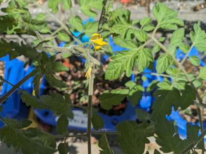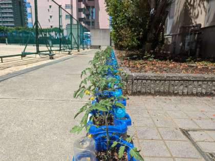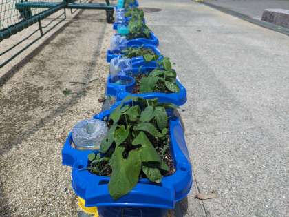 一雨ごとに、ミニトマトやあさがおが大きくなっています。ミニトマトは黄色の小さな花が、あさがおはしっかりした本葉が見られます。