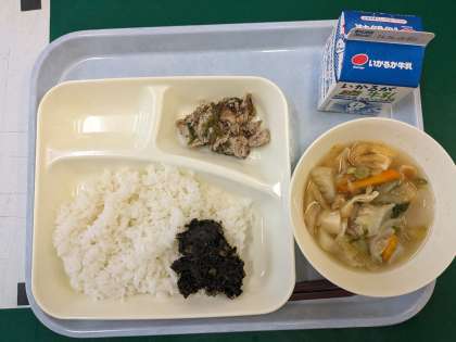 今日の献立は、豚肉の梅風味焼き、五目汁、のりのつくだ煮、ごはん、牛乳です。
