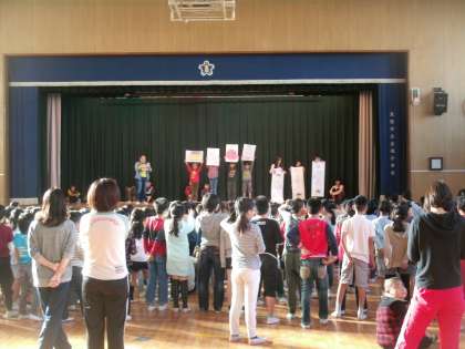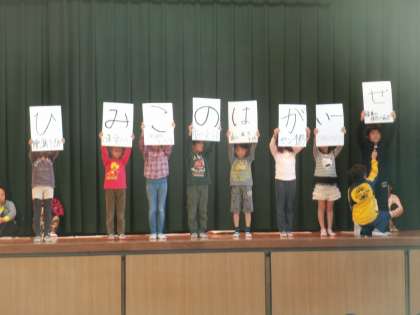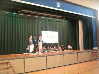 11月16日(月)の児童朝会で、健康委員会の子どもたちが学校保健委員会で報告した内容について発表しました。「噛ミング30(かみんぐさんまる)」、「卑弥呼の歯がいーぜ」といった合言葉を紹介したり、クイズをまじえたりしながら、わかりやすく発表していました。