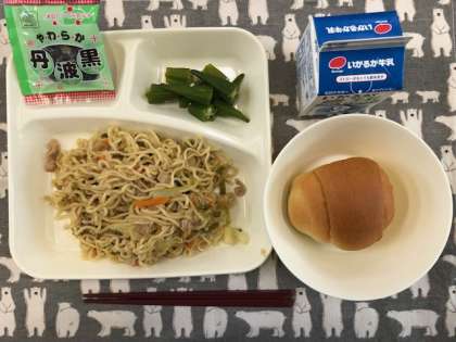 今日の献立は、・ミニコッペパン ・和風焼きそば ・オクラの甘酢和え ・ソフト黒豆 ・牛乳 です。