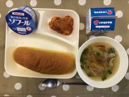 今日の献立は、・パンプキンパン ・えびのチリソース ・中華スープ ・ヨーグルト ・牛乳 です。
