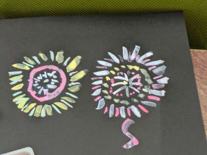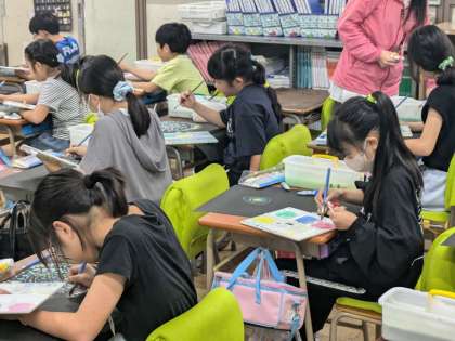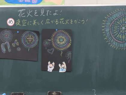 図工の学習です。絵の具で花火の絵をかいています。色鮮やかな花火がたくさんできています。