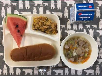 今日の給食は、・黒糖パン ・チキンパエリア ・ウインナーとキャベツのスープ ・すいか・ 牛乳 です。