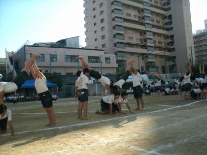 5・6年生合同の団体演技、組体操「絆 90th」の様子です。