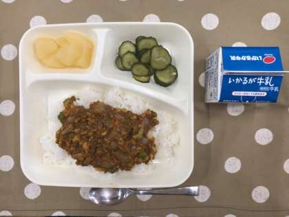 今日の献立は、・大豆入りキーマカレーライス ・きゅうりのサラダ ・洋梨の缶詰 ・牛乳 です。