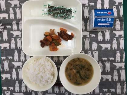 今日の献立は、・酢豚 ・中華スープ ・焼き海苔 ・牛乳 です。