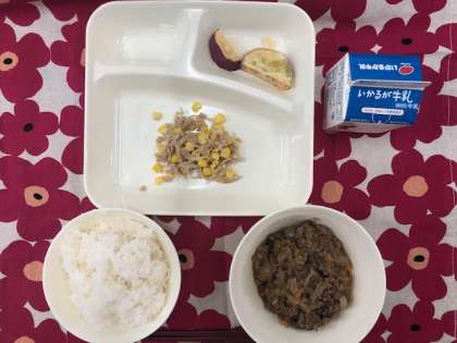 今日の献立は、・ご飯 ・マーボーナス ・ツナと野菜の炒め物 焼きさつまいものあまみつかけ ・牛乳 です。