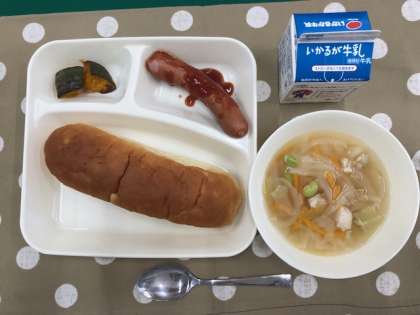9月11日(水) 本日の給食 公開日 2024/09/11 更新日 2024/09/11 お知らせ 今日の献立は、・おさつパン ・ウインナーのケチャップソース ・スープ ・焼きかぼちゃ ・牛乳 です。 いいね(0)