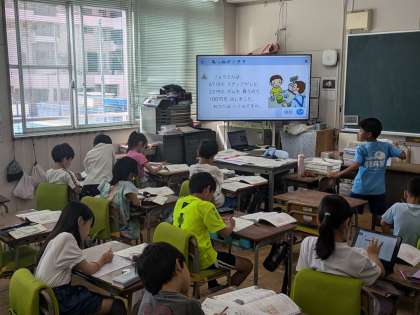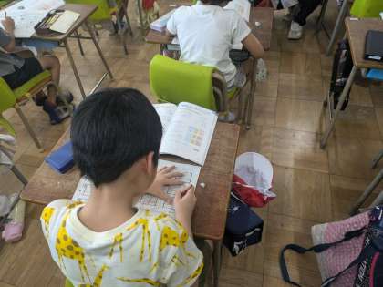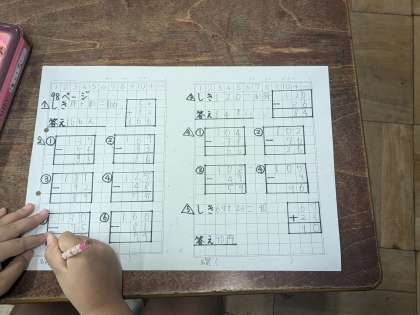 算数の学習です。引き算の筆算や文章題など、たくさんの問題に取り組んでいます。