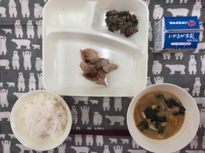 今日の献立は、・ご飯 ・鶏肉の照り焼き ・カボチャの味噌汁 ・ナスのそぼろ炒め ・牛乳 です。