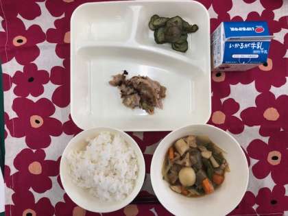 今日の献立は、・ご飯 ・豚肉のネギ醤油焼き ・吹き寄せ煮 ・きゅうりの赤紫蘇あえ ・牛乳 です。