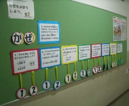 保健室前の掲示板に12月の保健目標「かぜをよぼうしよう」とともに、かぜをひかないようにするためのメッセージが掲示されています。これから、ますます寒さが厳しくなり、かぜをひきやすい季節になっていきます。この掲示板のメッセージを読んで、かぜを予防したいですね。