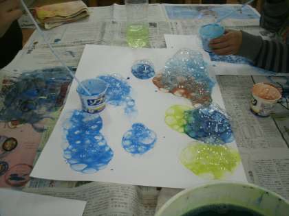 2年生、図画工作科の学習の様子です。子どもたちが、とても楽しそうに、生き生きと活動している姿、友だちと仲良く活動している姿がとても印象的でした。シャボン玉と絵の具で、このような表現ができるんだと、たいへん感心しました。