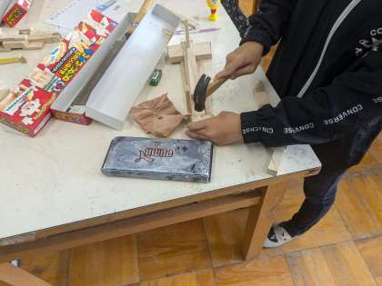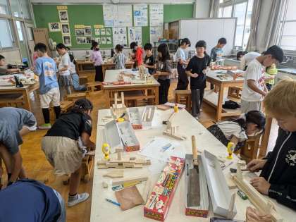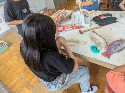 図形の学習です。金づちやのこぎりを使い、木の作品作りをしています。