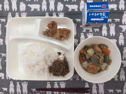 10月18日(金) 本日の給食 公開日 2024/10/18 更新日 2024/10/18 お知らせ 今日の献立は、・ご飯 ・鶏肉の竜田揚げ ・厚揚げと野菜の煮物 ・おかか菜葉 ・牛乳 です。 いいね(0)
