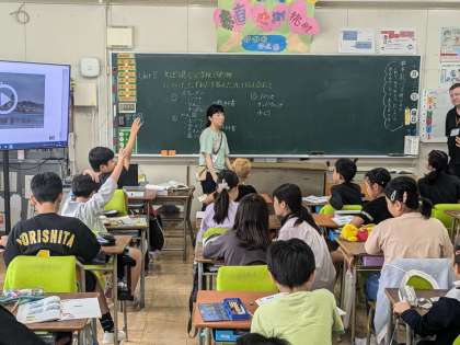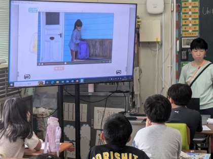 外国語の学習。3つの国の小学生のかばんに何が入っているかをききとり発表しました。