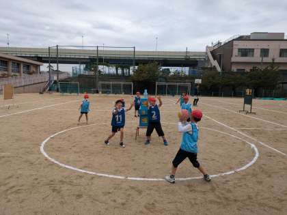 体育の学習です。シュートゲームをしました。ボールをパスしながら、相手の的を当てます。ゲーム中の声がよく出ています。