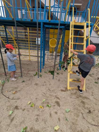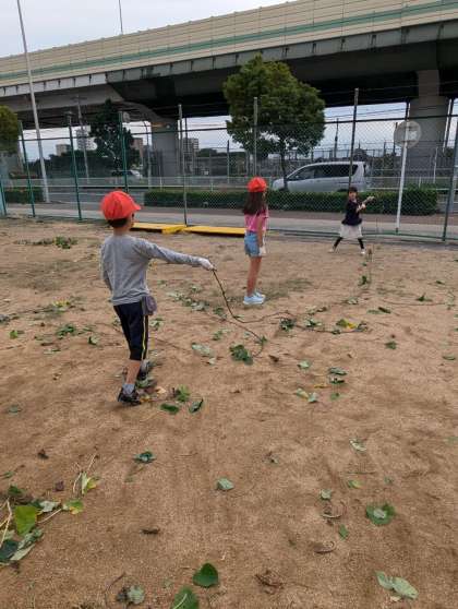 長くて丈夫なさつまいものつるで遊んでいます。