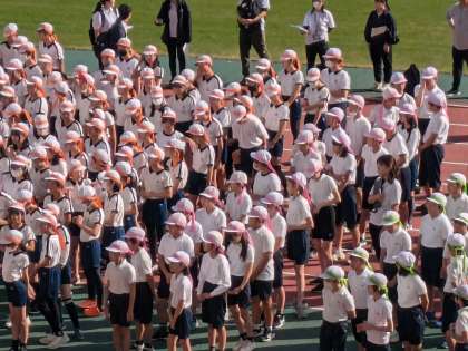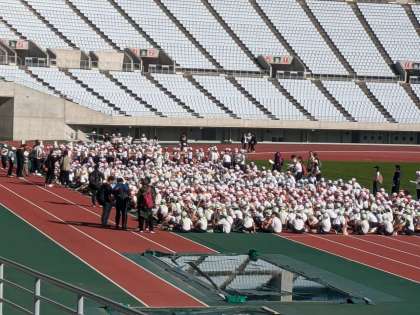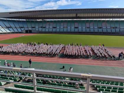 開会式が始まりました。阿倍野区内の9校が集まりました。スポーツ交歓会の開催は、5年ぶりだそうです。けがなく楽しい思い出が作れるよう過ごしてほしいです。