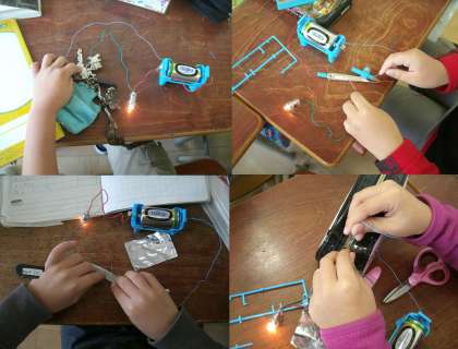 3年生の教室をのぞいてみると、理科の実験をしていました。乾電池と豆電球を使って電気を通すもの、通さないものを調べるのです。