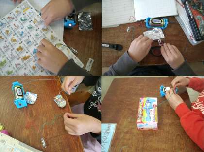 子どもたちの実験の様子を見ていると、家の鍵や筆箱の金具、コンパス、はさみの刃の部分等は明かりがつきました。それに対して、電池の胴体部分(極でない部分)、下敷きや消しゴム、はさみの持ち手の部分等は明かりがつきませんでした。