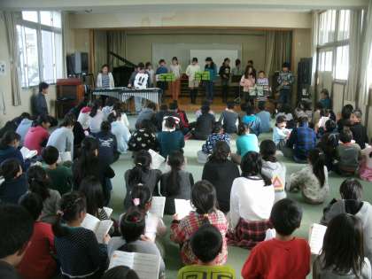 12月24日(木)の昼休み、多目的室で音楽クラブの発表がありました。たくさんの子どもたちが多目的室を訪れ、音楽クラブの演奏に聴き入りました。その後、音楽クラブの演奏に合わせて、みんなで「あわてんぼうのサンタクロース」を大合唱しました。アンコールの声がかかり、もう一度「あわてんぼうのサンタクロース」を大合唱しました。大いに盛りあがった多目的室は、さしずめクリスマスコンサート会場のようでした。