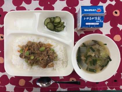 今日の献立は、・ピリからどんぶり ・中華スープ ・きゅうりの甘酢漬け ・牛乳 です。
