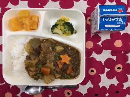 今日の献立は、・冬野菜のカレーライス ・ブロッコリーとコーンのサラダ ・黄桃の缶詰 牛乳 です。