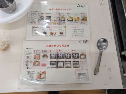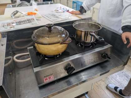 家庭科調理実習。ごはんとみそ汁を作りました。ガラスの鍋でごはんがどのように炊き上がるのか観察し、火加減を調整しながら上手に炊きあげました。みそ汁は、煮干しでだしを取りました。野菜を柔らかくなるまでにたり、味を見ながらみその分量を調節したりするのが難しそうでした。