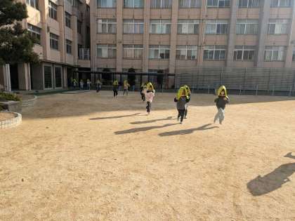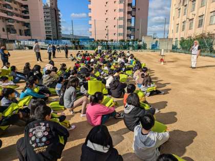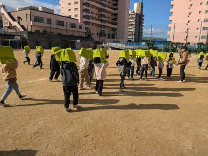 阪神淡路大震災から30年目の「防災とボランティアの日」に、地震、津波の避難訓練を行いました。地域からいただいた防災ずきんをかぶり、静かに避難できました。2学期の防災学習でもお世話なった大阪災害ボランティアの皆様がお見えになり、訓練の様子を見ての感想をお話ししてくださいました。引き続き続津波の避難訓練を行いました。