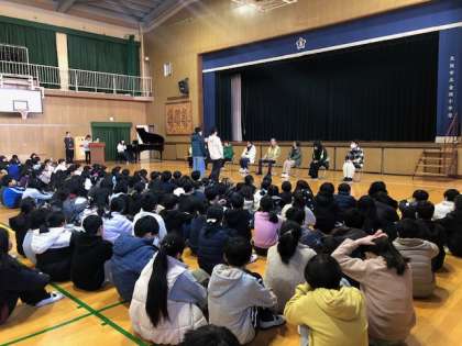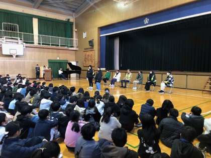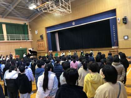 6年生の代表がお礼の言葉を述べた後、感謝の気持ちを込めて、全児童が「世界に一つだけの花」の歌のプレゼントをしました。